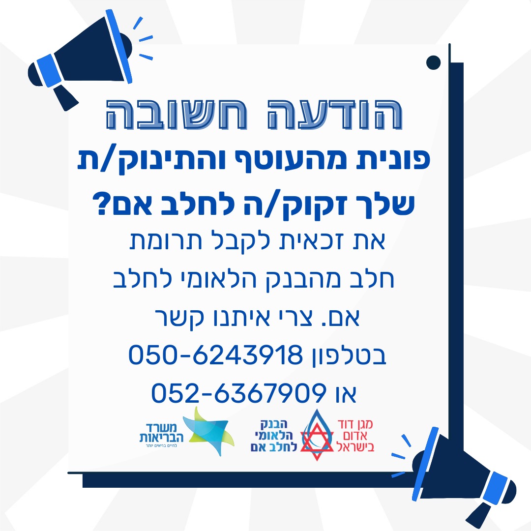 Lahav association has established a fund to ensure that breast milk is accessible to needy babies from the National Breast Milk Bank. Due to the current circumstances, there is a heightened demand for breast milk, and your donations will help us continue to provide this vital resource to infants in need, even after the emergency situation has subsided.