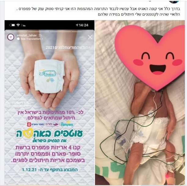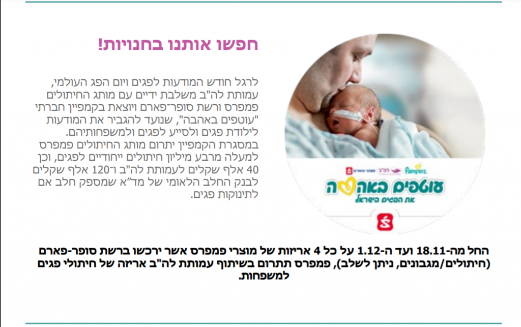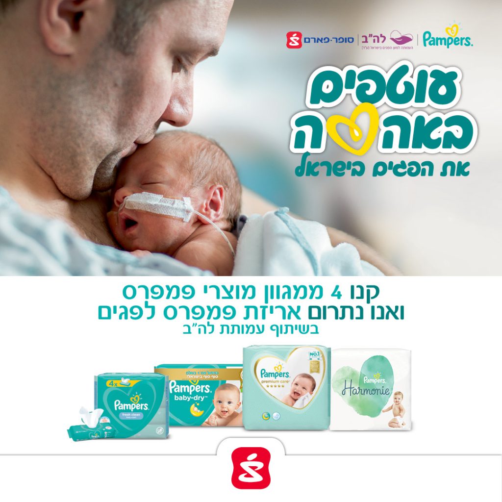 The Pampers brand, Super-Pharm and the Association for Premature Infants (LAH) have joined forces to donate about a quarter of a million diapers to premature babies. The campaign "Wrapped in Love" aims to increase awareness of premature births (1 out of every 10 babies) and to ensure that premature babies in Israel have access to Pampers' unique diaper that supports better sleep, protects their skin and dies to their tiny size (the smallest diaper comes in a tiny size of only 8 cm, smaller than the palm of our hand).